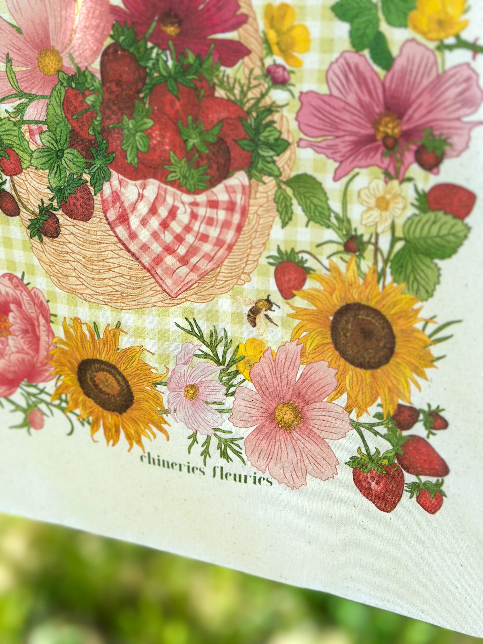 Il est décoré d’un joli panier rempli de fleurs d’été et de fraises, l’un de nos fruits préférés bien sûr !