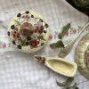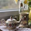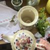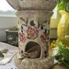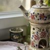 Elle est composée d’une belle tisanière ou verseuse décorée de fleurs – contenance pour une personne. Elle s’imbrique sur la veilleuse permettant de garder votre tisane au chaud. Dans cette veilleuse, un petit godet s’insère, dans lequel on mettait de l’huile et une mèche pour à la fois chauffer et éclairer.